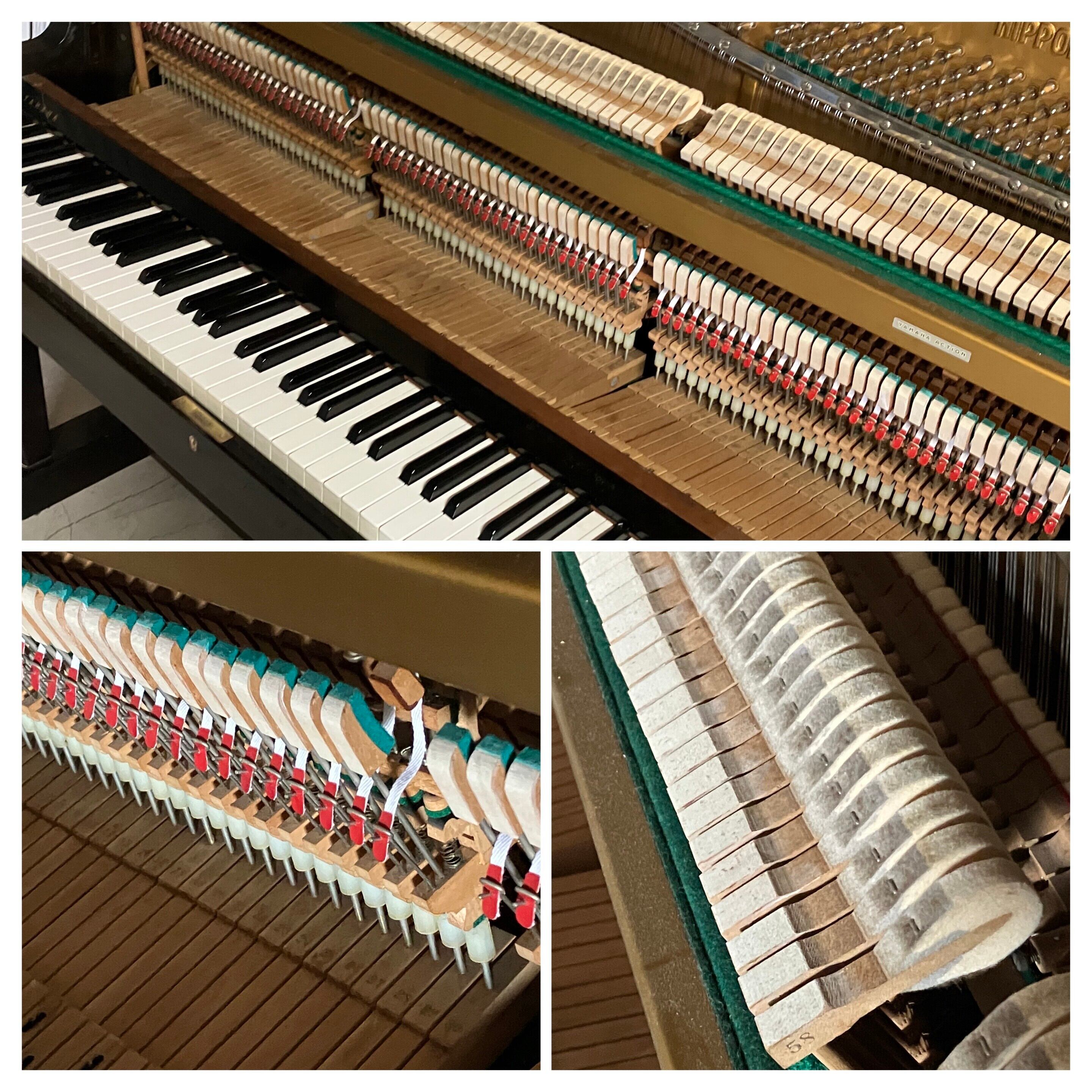 弦、ピン、ブライドルテープ、フレンジコード、ダンパーヘッド、パンチングコード交換その他不具合箇所はすべて修理交換しました。また金属部分の磨き、鍵盤バフ仕上げをしました。